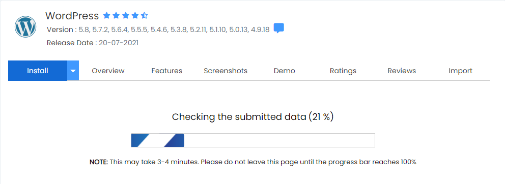 12. Once done, click Install. A progress bar will show your installation status and refresh once the installation is complete. Do not close the browser while this is in progress, as it can interrupt the installation