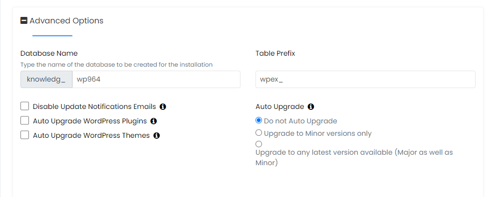 10. In the Advanced Options section, the options don't need to be changed, but they include the database name, table prefix, disable update notification emails, set auto-upgrade, and more.
